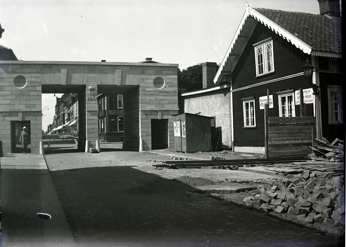 Jordbroporten i Kalmar. Nylagd stengata. T h den lilla "värmestugan" som sedan flyttades till Rinkabyholm.