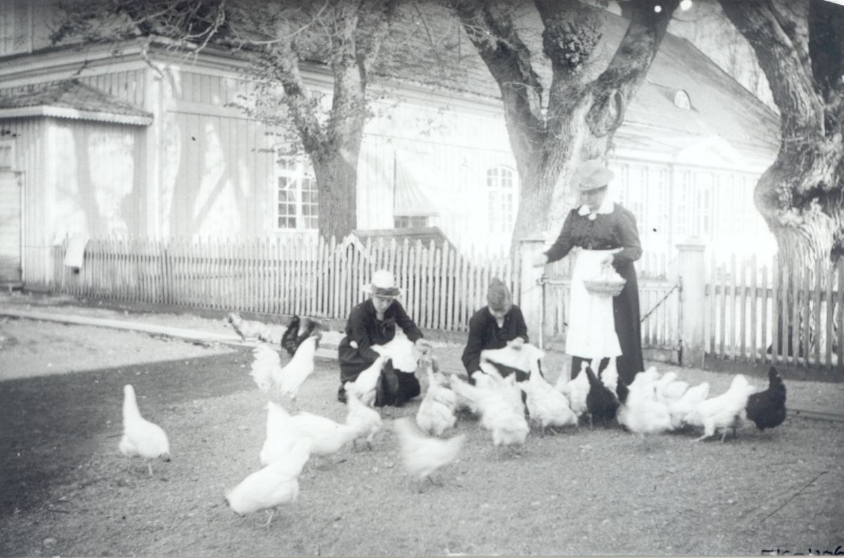 Misterhults gård. I förgrunden förvaltare Karlbergs fru med döttrar matande hönsen.