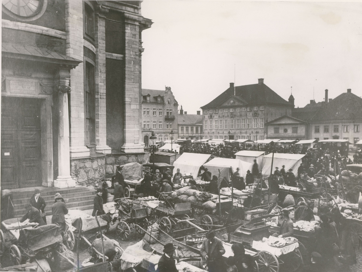 Torghandel omkring 1920. Vid kyrkmuren en Fordbil ägd av Nybergs slakteri Läckeby.