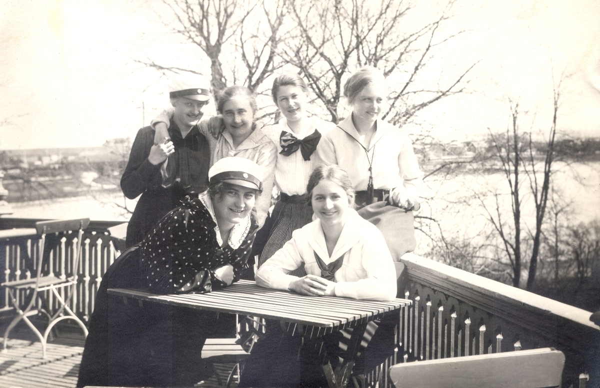 Grupporträtt på studenter med vänner. Bilden är möjligen tagen på terrassen på Bredablick på Skansen i Stockholm.