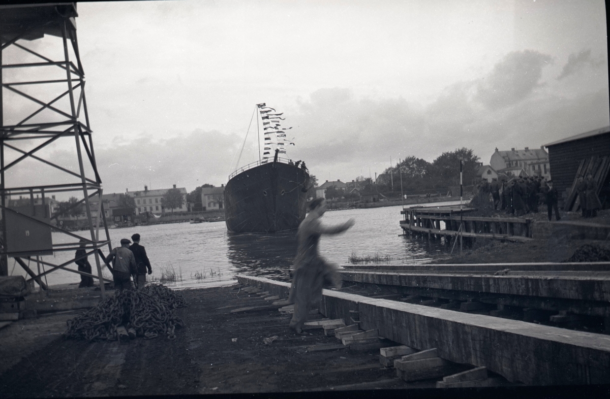 Titel: Sjösättning av fartyg på Kalmar varv med festligheter, 1940-talet.