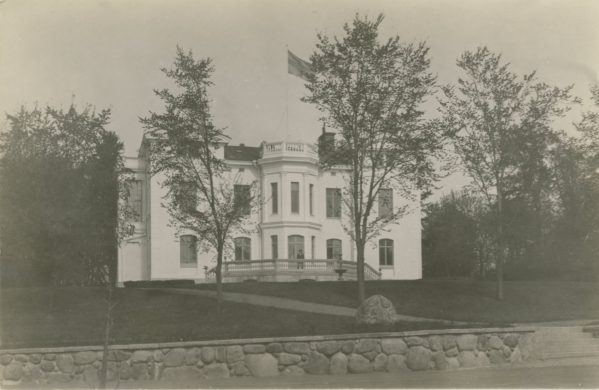 Titel: Villa Skansen. Den som lät bygga villan 1883 var handlaren och v. konsuln John Oskar Roosval. Arkitekten John Wilhelm Löfmark har ritat villan.