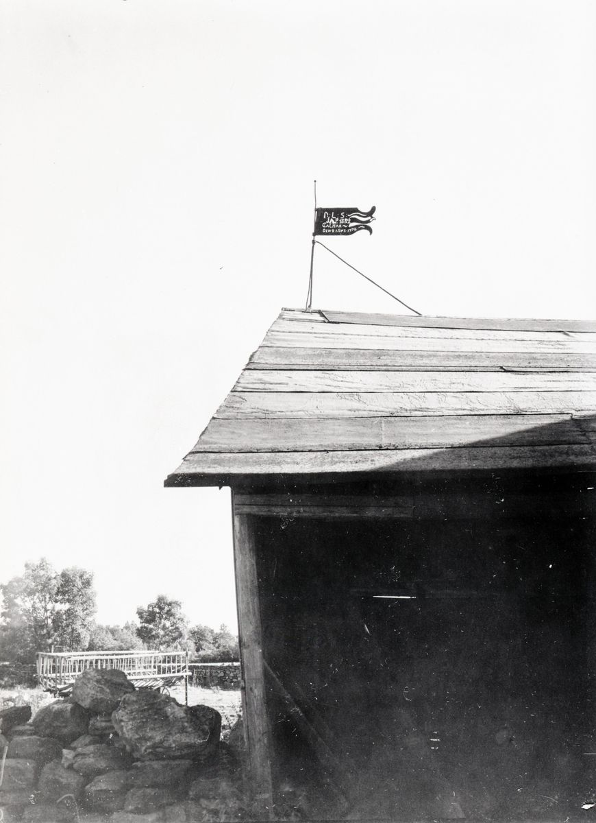 Tveta gård. Vagnboden vid vägen. Flöjel av järn med inskriptionen P:L:S IAP 1882 Calmar den 2 sept 1792.