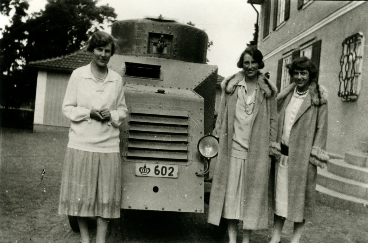 Berga, Svensknabben. Lilla Villan. Mertha Jeansson, Dagmar Bager, Maj de Novion vid pansarbil 1930-tal.
