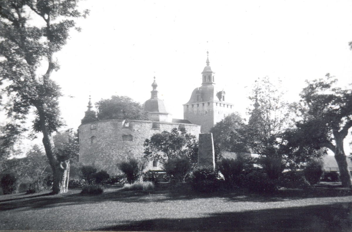Kalmar stadspark med minnesstenen över Kalmar regemente. Kalmar slott i bakgrunden.