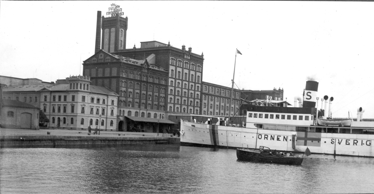 Tullhamnen i Kalmar med fartyget Örnen. I bakgrunden ses ångkvarnskomplexet. Observera den svenska flaggan som är målad midskepps på Örnen. Under andra världskriget målades sådana på alla civila svenska fartyg så att de inte skulle torpederas av misstag.