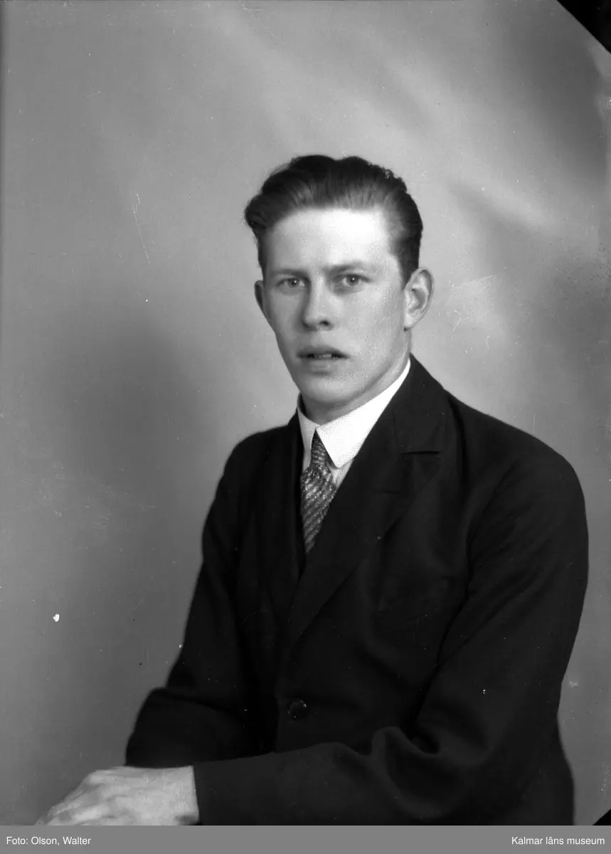 Ateljébild på en man i kavaj och slips. Enligt Walter Olsons journal är bilden beställd av Emil Andersson.