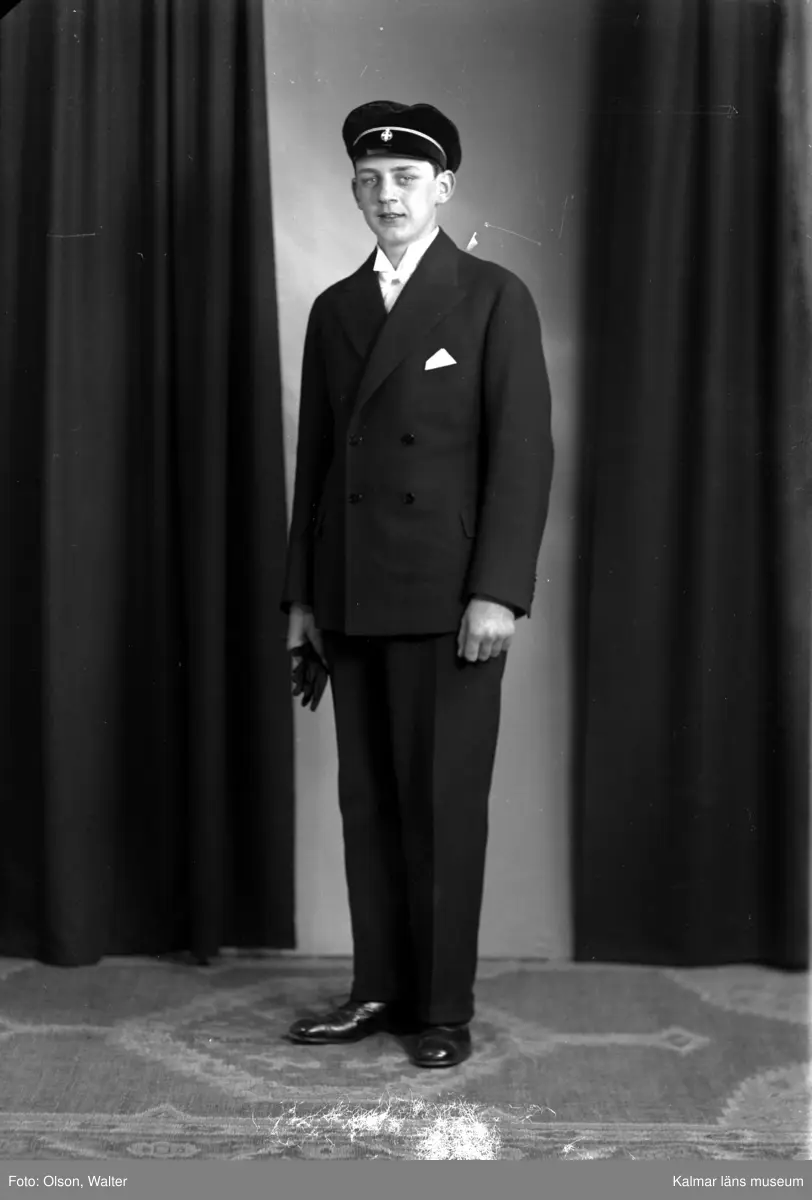 Ateljébild på en pojke i kostym. Enligt Walter Olsons journal är bilden beställd av Olle Nilsson.