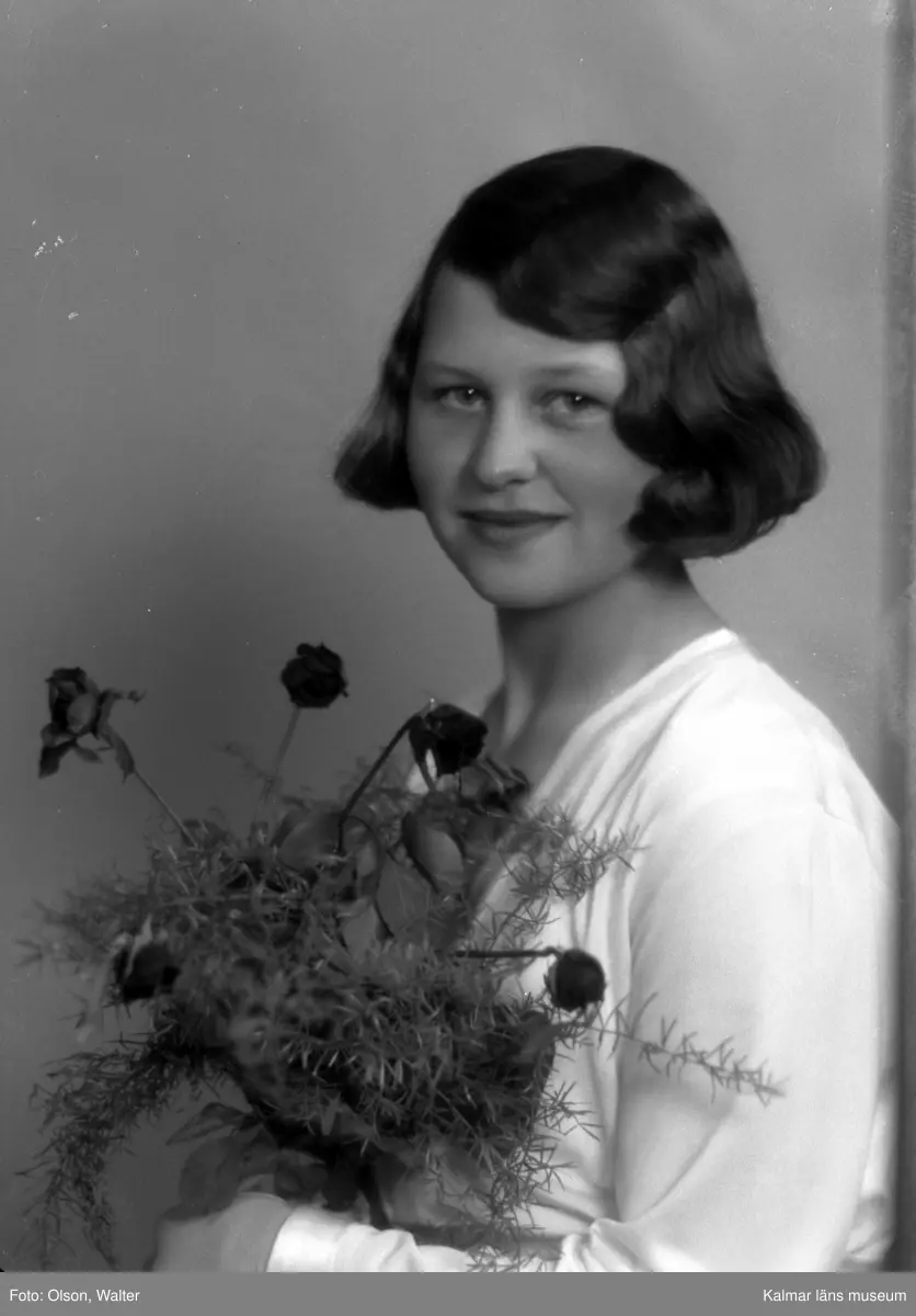 Ateljébild på en kvinna som håller i en blombukett. Enligt Walter Olsons journal är bilden beställd av Maj Johansson.