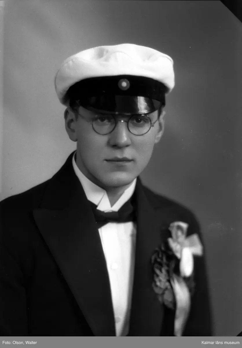 Ateljébild på en man som har tagit studentexamen. Har en studentmössa och studentkrans. Enligt Walter Olsons journal är bilden beställd av Anders Lindgren.