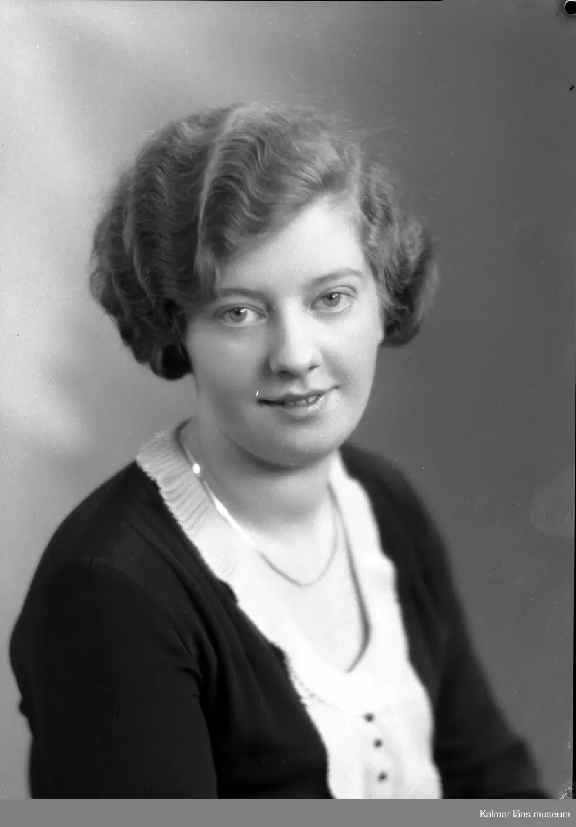 Ateljébild på en kvinna i halsband och jumper. Enligt Walter Olsons journal är bilden beställd av Vera Andersson.