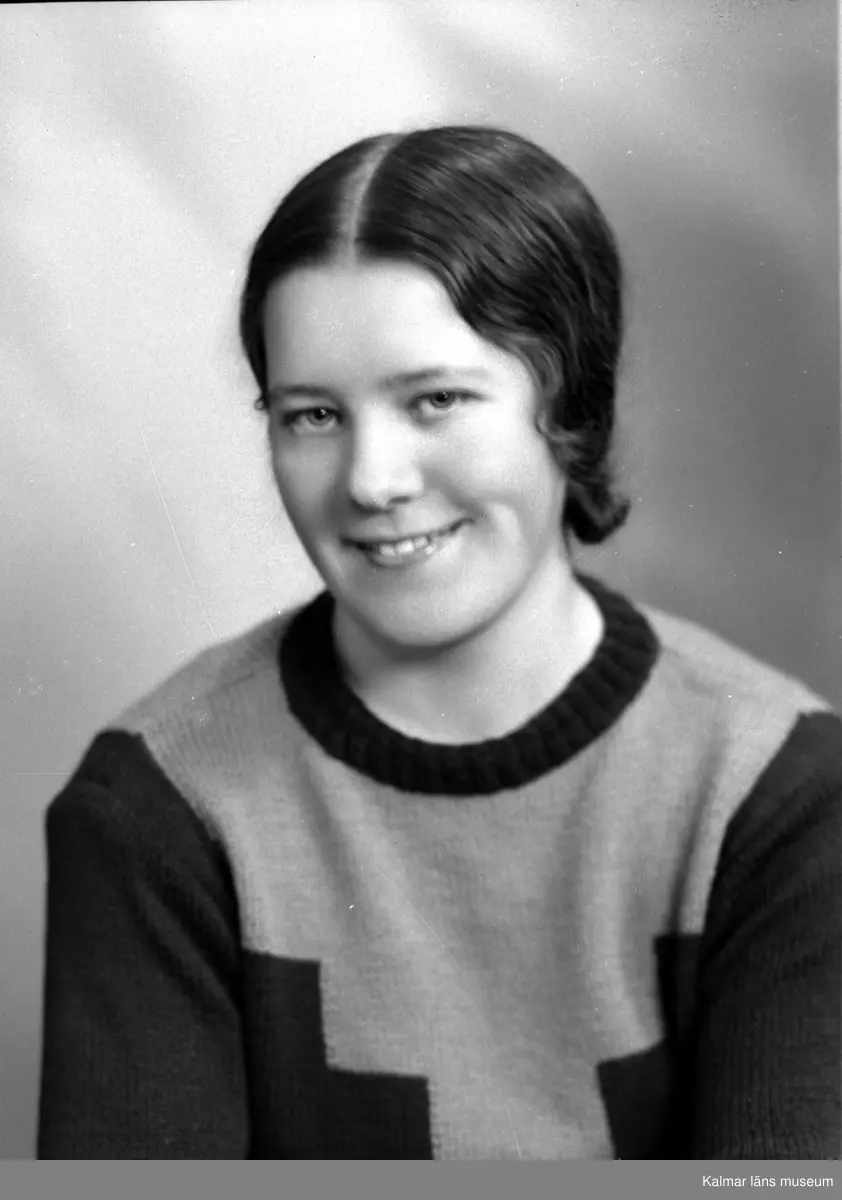 Ateljébild på en kvinna i jumper. Enligt Walter Olsons journal är bilden beställd av Anna-Lisa Mattsson.