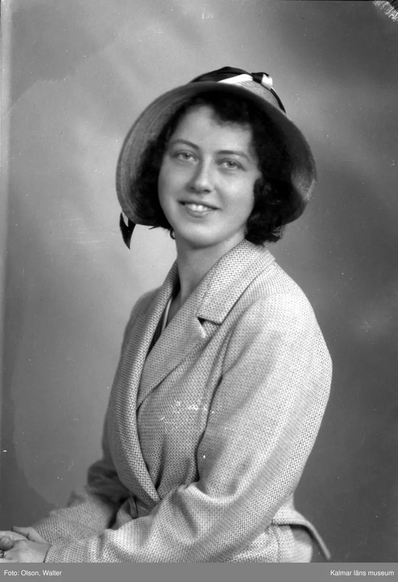 Ateljébild på en kvinna i hatt och kappa. Enligt Walter Olsons journal är bilden beställd av Margit Andersson.