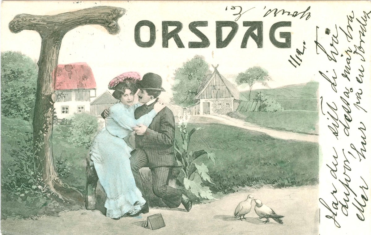 Vykort skickat till Kristina Andersson, född 1865 i Böda, syster till N J Andersson, när hon bodde i USA. Det är skrivet av Edvard Nilsson i Böda. På sidan av kortet står skrivet: "1/12. Har du sitt di två dufvor, dessa mår bra eller hur på en torsdag. Yours E."