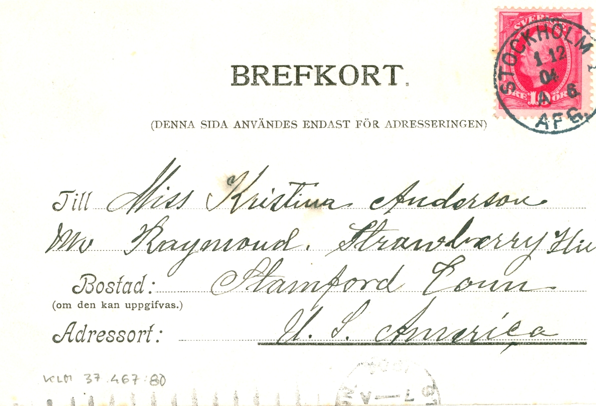 Ett vykort till Kristina Andersson, Stamford, Connecticut, USA från Edvard Nilsson i Böda.