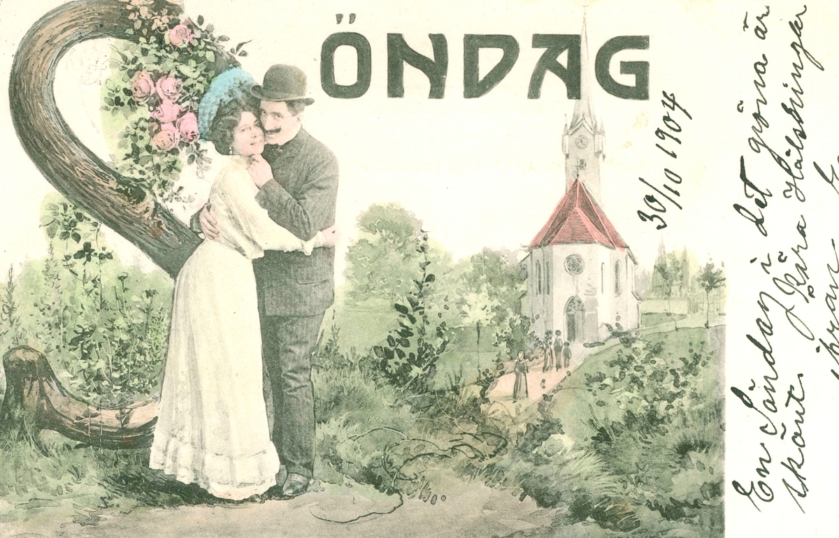 Vykort skickat till Kristina Andersson, född 1865 i Böda, syster till N J Andersson, när hon bodde i USA. Det är skrivet Edvard Nilsson i Böda. På sidan av kortet står skrivet: "30/10 1904. En söndag i det gröna är skönt. Kära hälsningar från E."