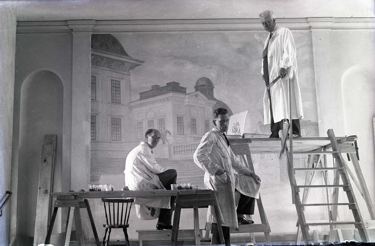Prins Eugen assisterad av två medhjälpare utför dekorationsmålning i Kalmar läroverk.