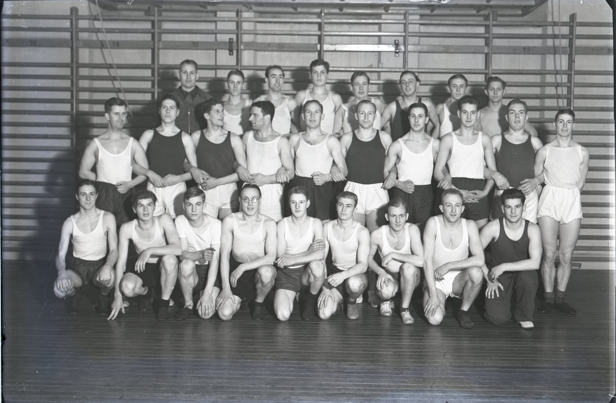 Grupporträtt av okända idrottsutövare i en gymnastiksal.