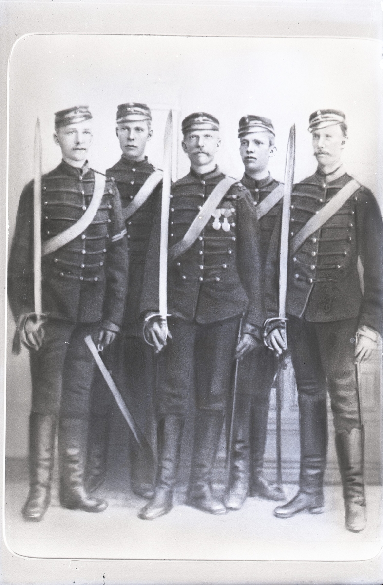 Grupporträtt av uniformerade militärer med dragna sablar.