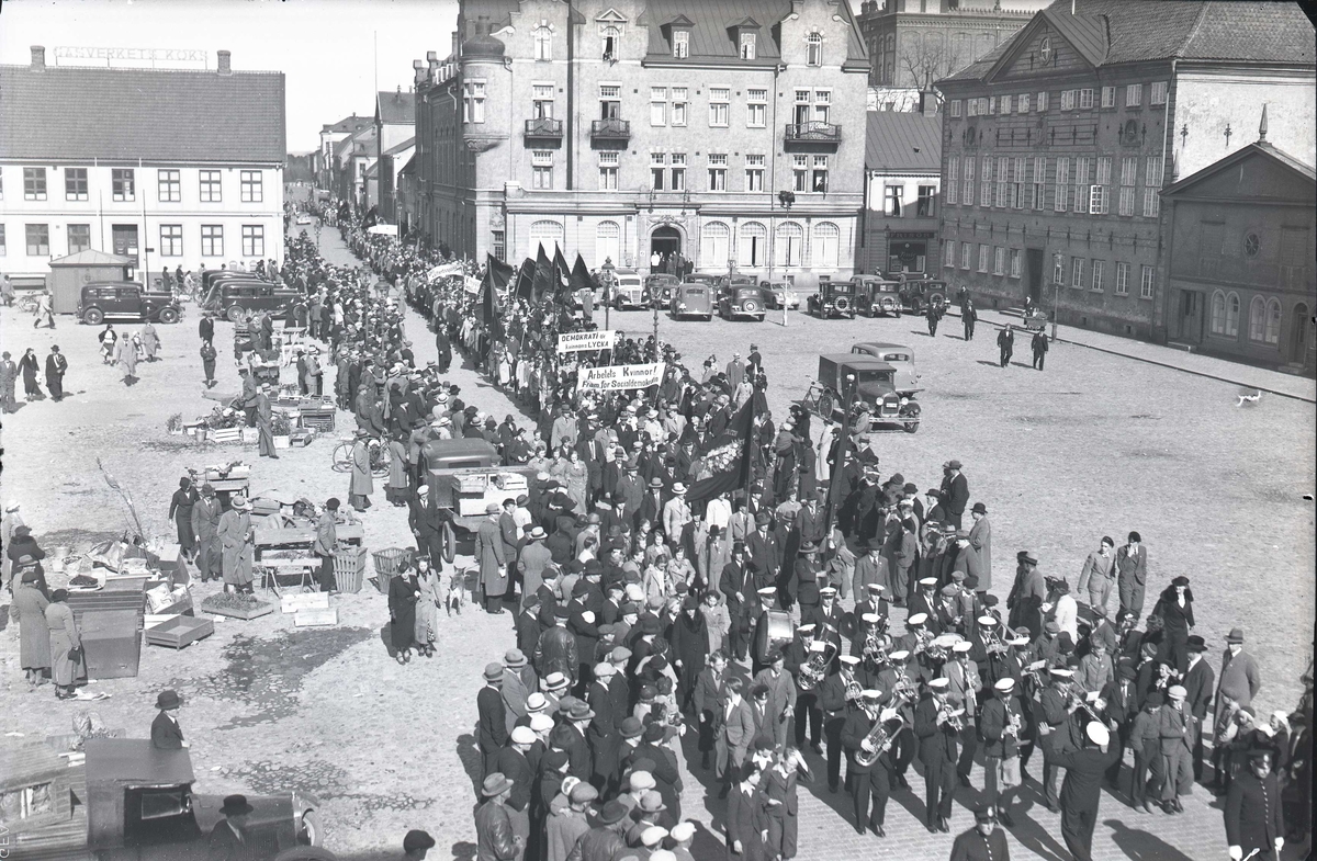 Demonstrationståg, troligen 1:a maj, på Stortorget i Kalmar.