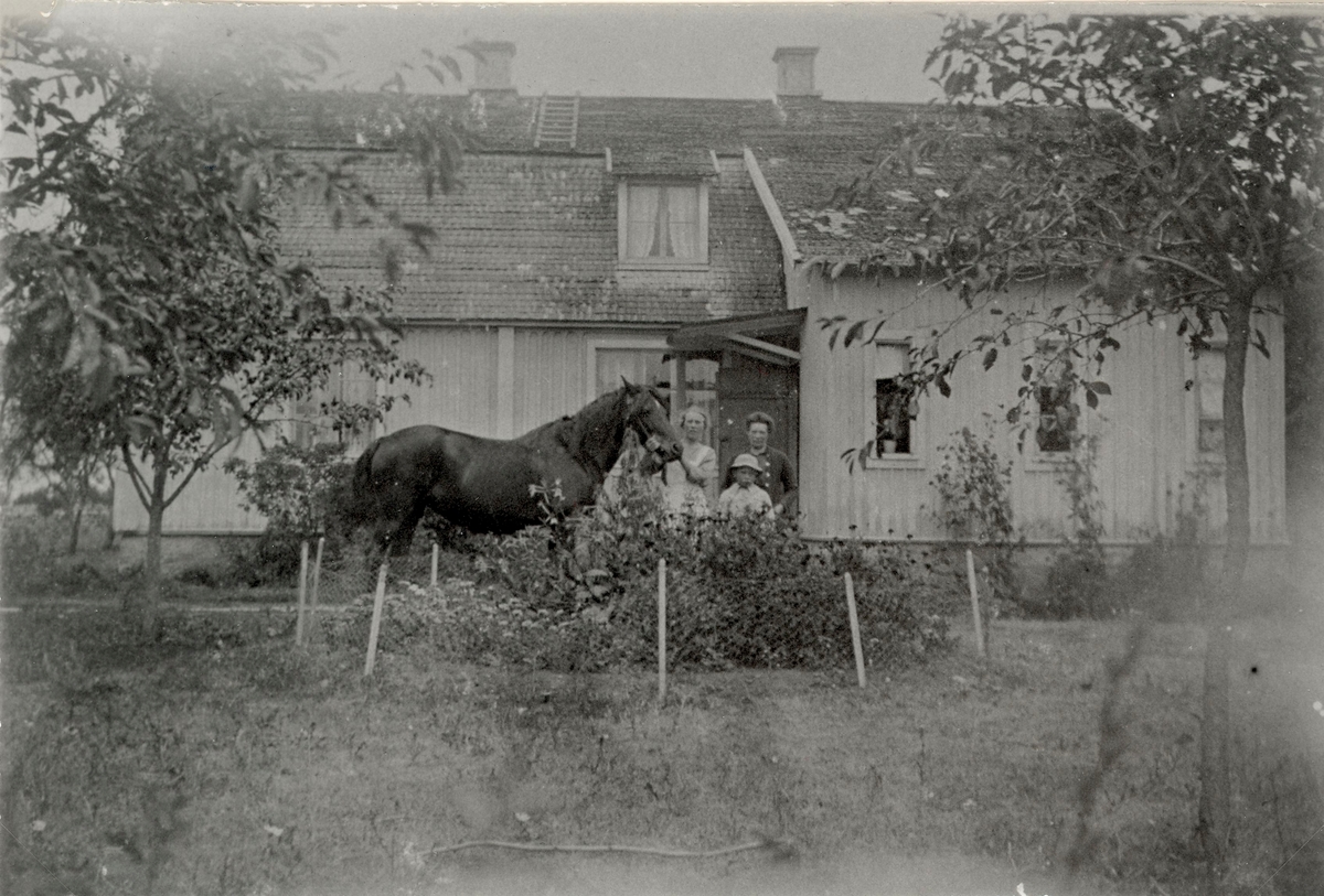 Gårdsägarens hustru Hulda Engström med sonen Martin, till vänster dottern Jane. Familjen visar stolt sin häst.
