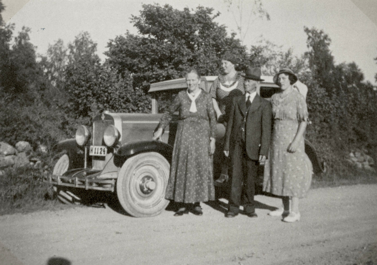 Algutsrumbor på biltur. Ragnar Larssons andra bil, en Chevrolet modell 1929.