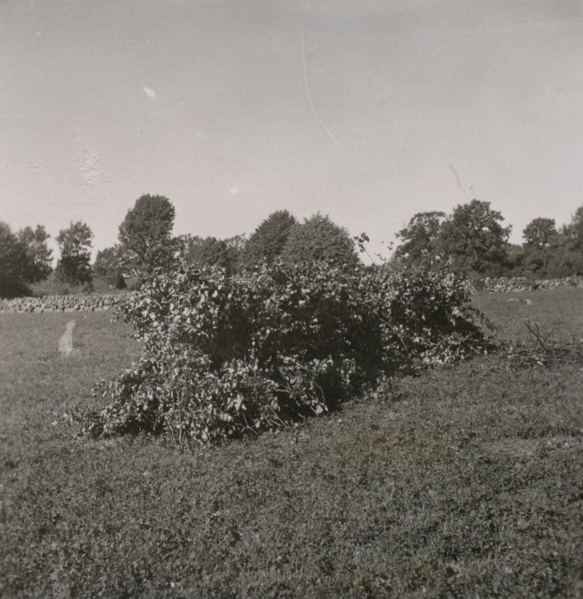 Titel: Lövtäkt. Lövet torkas för att komplettera detta [1938] års dåliga höskörd. Lövet används huvudsakligen som fårfoder.