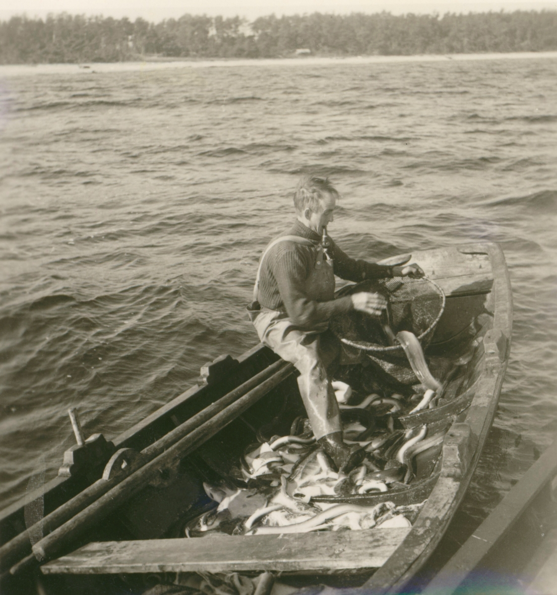 Titel: Jonas Olsson i Svartvik. Ålbottengarnsfiske.
