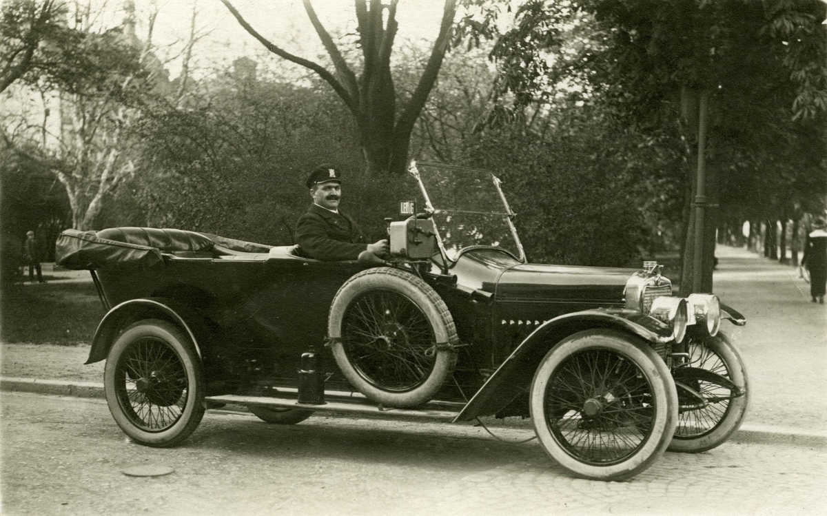 Fotografi av okänd man i bil. Kortet är adresserat till herr John Lundin. Glad Pingst 1919.