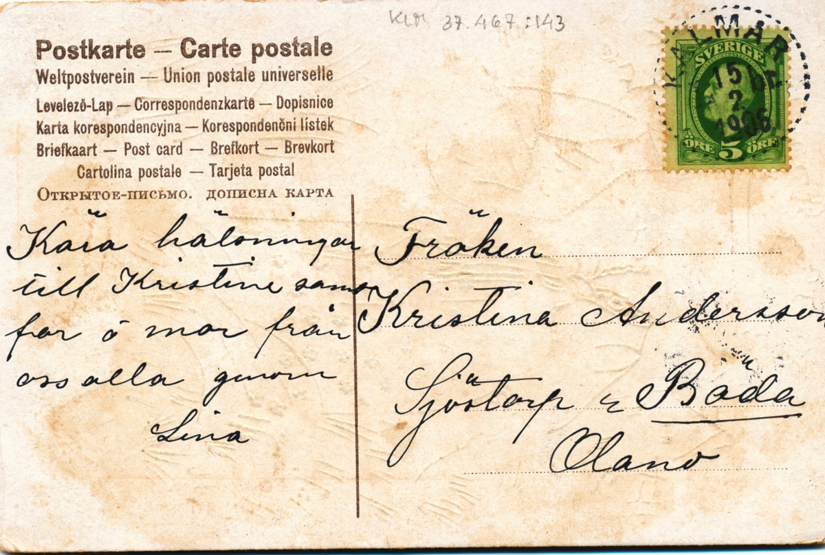 Ett vykort till fröken Kristina Andersson, Sjötorp, Böda, Öland. På kortets baksida står: "Kära hälsningar till Kristina samt far och mor från oss alla genom Lina.