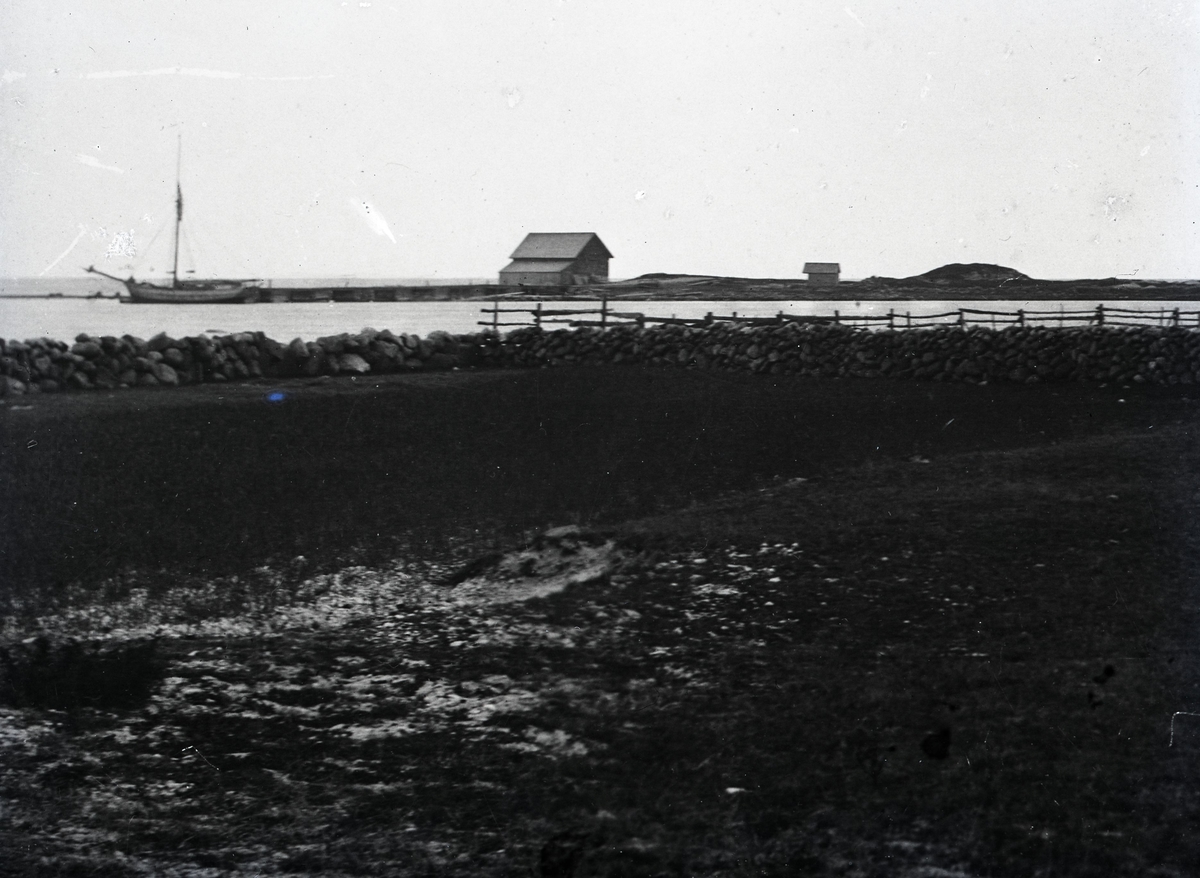 En båt, byggnad, kaj och stenmur vid en hamn i Böda.