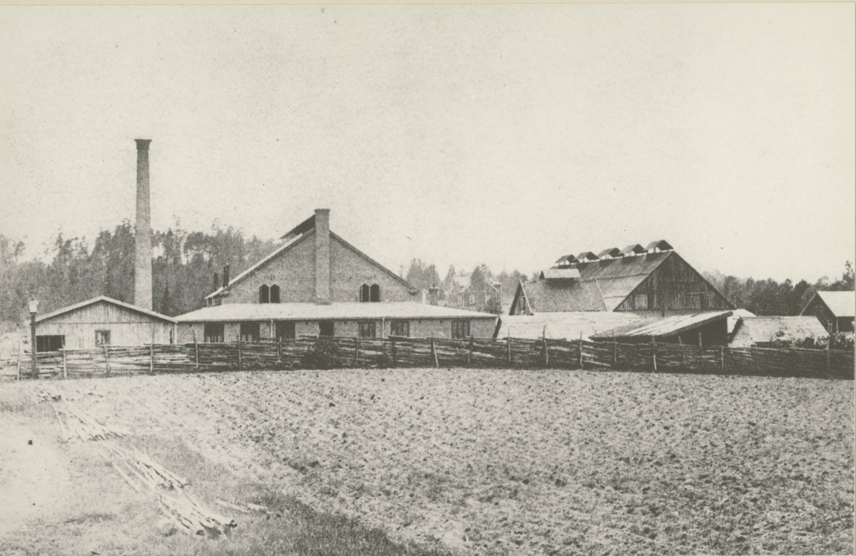 Pukebergs glasbruk från öster. Till vänster den gamla hyttan av sten som stod färdig 1896, till höger den år 1895 uppförda provisoriska hyttan. Fotot troligen från 1896.