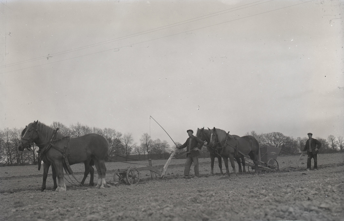 Potatissättning med parhästar, ett par gör rännan med årder, efter kommer ett par som som sätter potatisen.