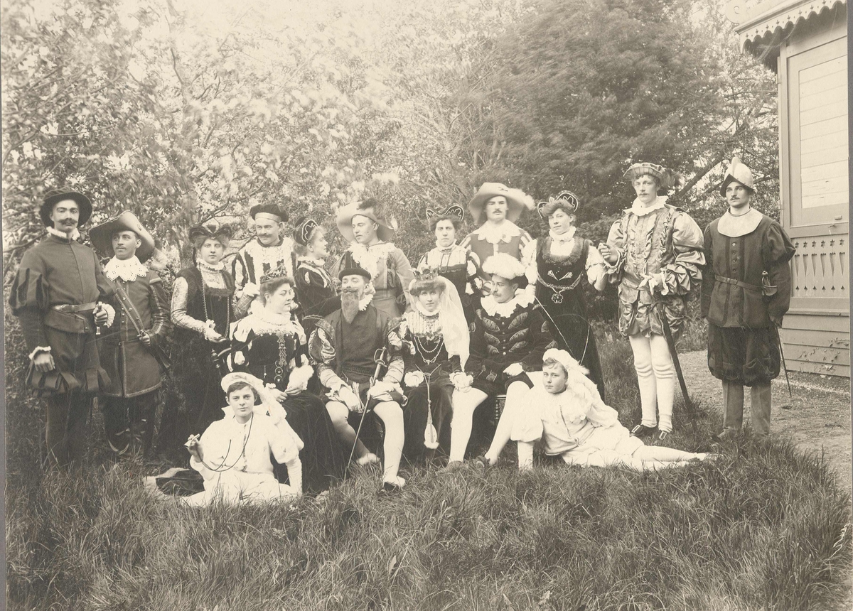 Första Barnens Dag 1906. Personerna, stående fr. v.: Håkan Wickbom, Filip Eriksson, Elin Haglund, Pelle Ödman, Greta Wåhlin, Gunnar Sahlberg, Signe Bruun, Waldemar Thom-