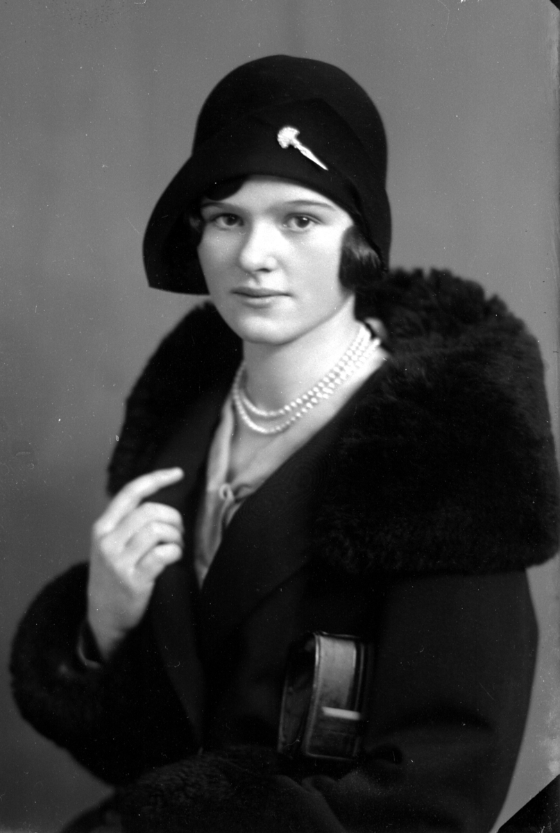 Ateljébild på en kvinna i hatt och kappa med pälskrage. Enligt Walter Olsons journal är bilden beställd av Elisabet Andersson ifrån Kalmar.