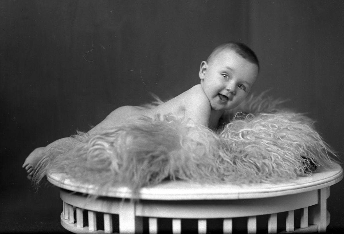En bebis på ett fårskinnsfäll. Vederbörande som beställde bilden av fotografen: Körsnär Palmquist ifrån Kalmar.