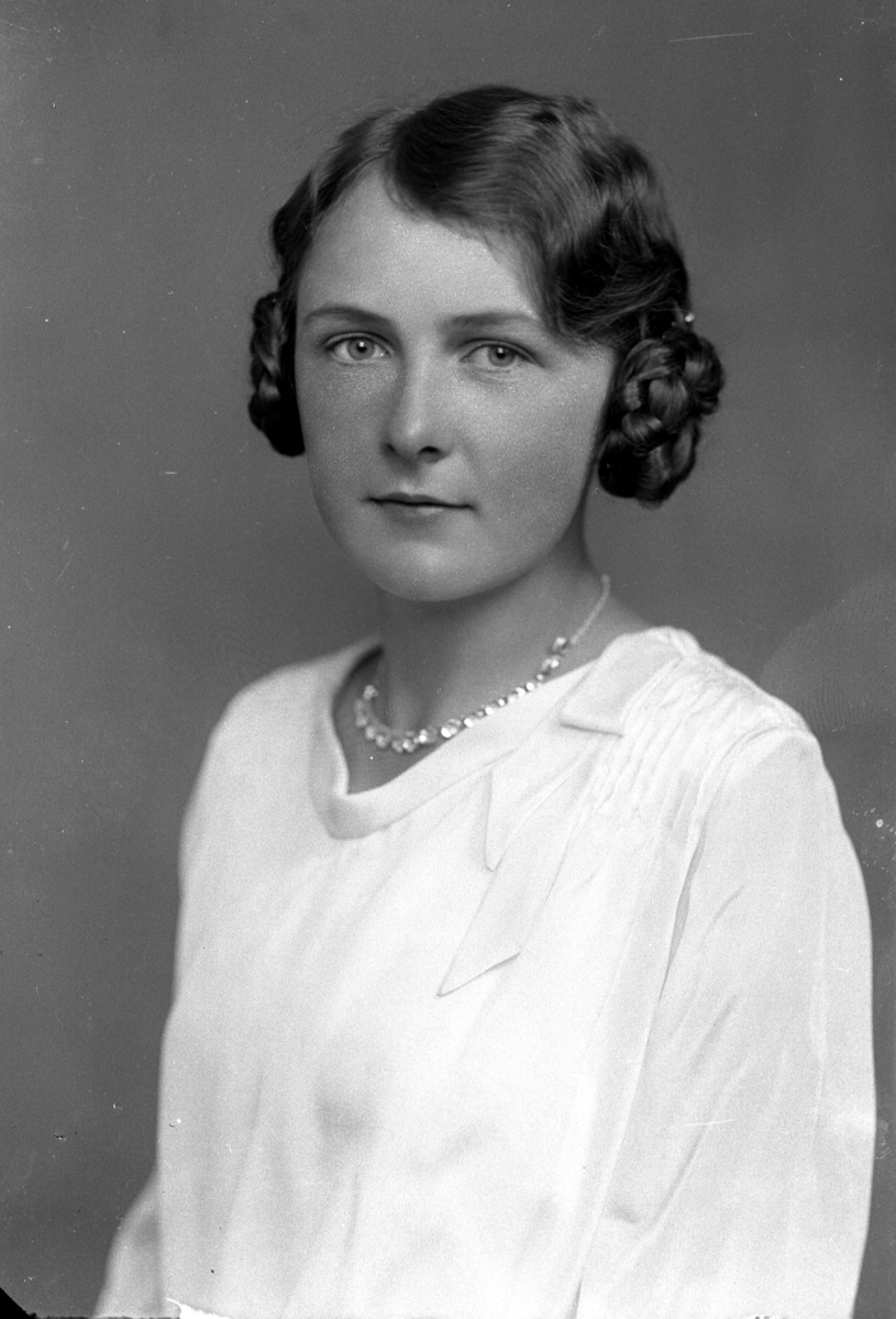 Ateljébild på en kvinna i halsband och håruppsättning.