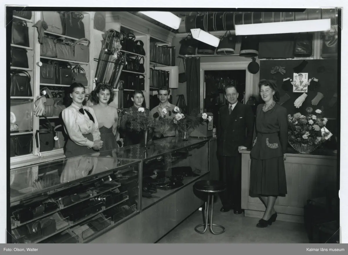 Närstads Handsk-Väsk-Paraplyaffär på Larmgatan. Innehavare Sven Närstad. Bilden är tagen 1948 men butiken sr ännu 2021 i stort likadan ut.