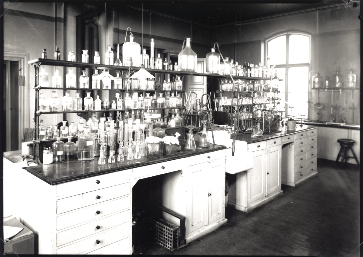 Kalmar Kemiska Station. Laboratorium med laboratoriekärl, flaskor och provrör.
