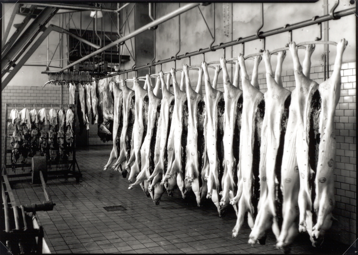 Interiör från Kontrollslakteriet i Kalmar. Griskroppar på krokar.
