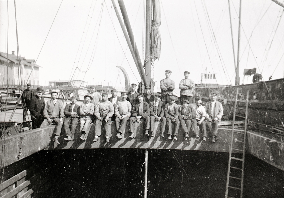 Besättningen på okänt fartyg uppradade på lastrumskanten.