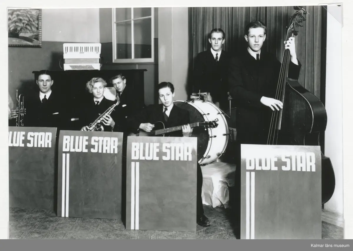 Blue Star dansorkester. Interiör från Pianomagasinet, Frejagatan 3, Kalmar. Från vänster: Sven Karlsson-Kalmbäck - trumpet, Bertil Hammerth - Altsax, Gunnar Hammerth - piano, Tore Backlund - gitarr, Olle Abrahamsson - trummor, Allan Hill - kontrabas.