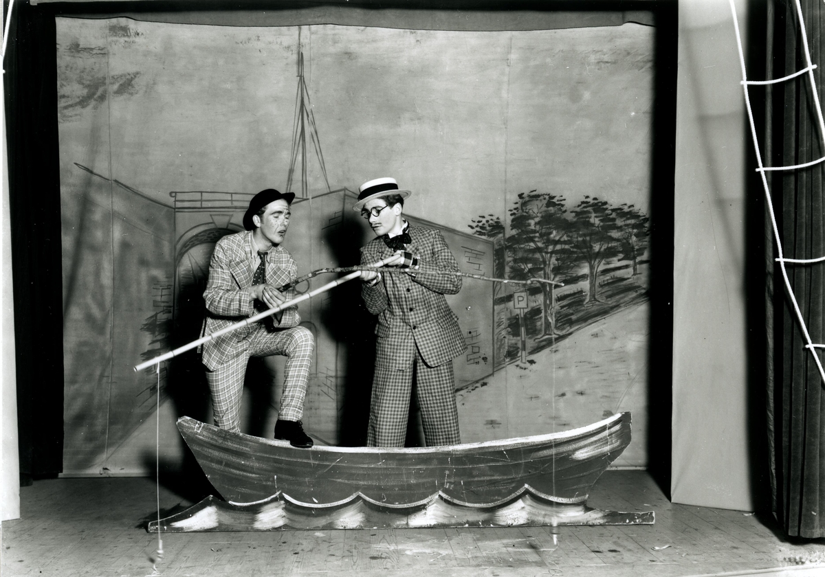 Scen ur revyn "På kryss med Beata" år 1943 i I.O.G.T.-lokalen, Strömg., Kalmar. Från v.: