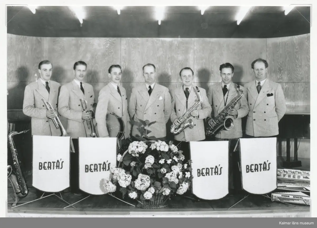 Bertås orkester. Fotot är taget iden nyöppnade danspaviljongen i Folkets Park, Kalmar. Premiären var fredagen 30/4 och lördagen 1/5 1943. Från vänster: Sven-Gunnar Frieberg - född 1920 - trumpet, Alf Widerberg - född 1918 - tenorsax - klarinett - trumpet, Roland Käck - född 1915 - trummor, Bertil Åkerlund - född 1905 - piano och kapellmästare, Ove Rosdal - född 1915 - altsax - klarinett - violin - dragspel, Fred Brandin - född 1920 - tenorsax - klarinet - dragspel, Olle Palmér - född 1911 - kontrabas.