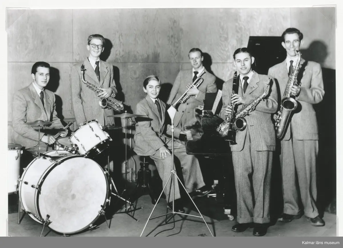 Cotton, från vänster: Sture Berglund - trummor, Rund Falk - altsax, Jan Andrén - piano, Göte Franzén - trumpet, Per-Olof Nilsson - klarinett - altsax, Kalle Carlswärd - tenorsax.