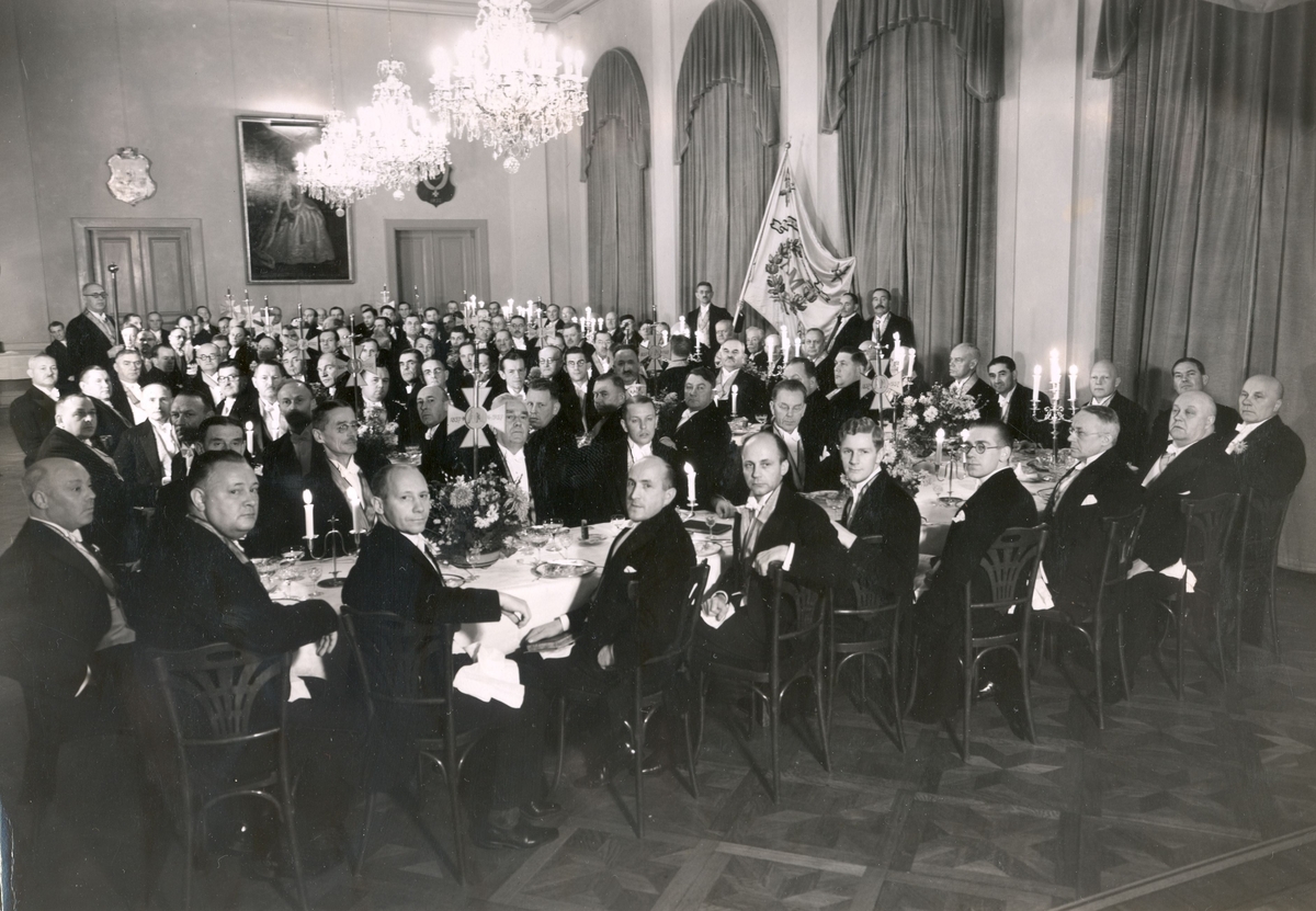 100-årsfesten för sällskapet ÅM 1937. Vid främsta bordet från vänster: 1. Grosshandlare Einar Thernström, 2. Advokat Ragnar Allmér, 3. Bankkamrer E Blomgren, 4. Handelsbiträde Sture Sandahl, 5. Bankkamrer E Blomgren, 6. Kontorist Rune Widjer, 7. Kontorist Witte, 8. Bankdirektör A Sundquist, 9. Disponent E Slettengren, 10. Grosshandlare V Fransson, 11. Kamrer E Westerlund, 12. Grosshandlare V E Hagman, 13. Tandläkare E Willius, 14. Direktör H Bergvall.