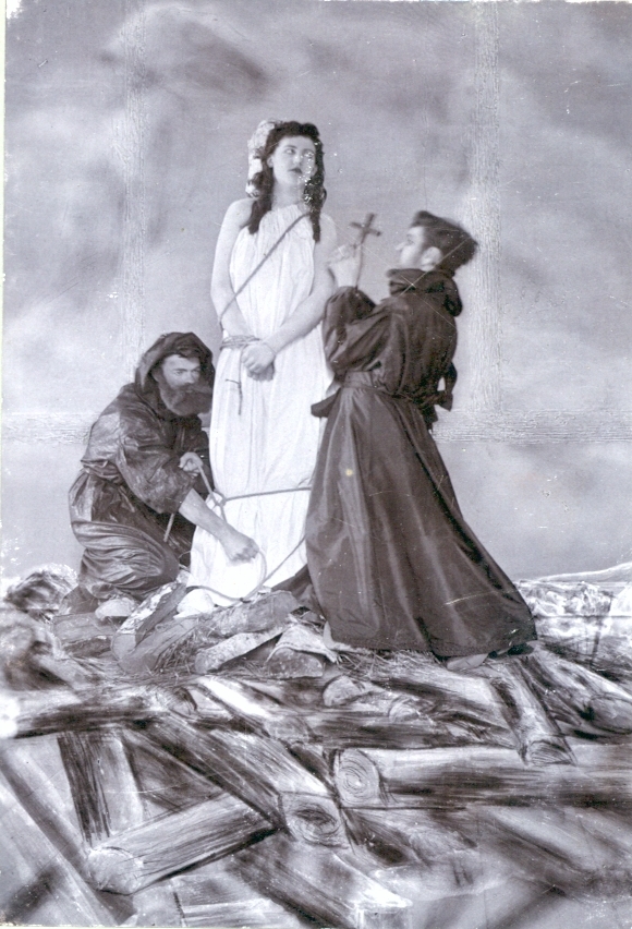 Soaré i Brage N 3 i gymnastiksalen 4 mars 1899. Tablå: Inkvisitionens offer. Fr.v: Paul Fogelberg - bödeln, Gunnar Sahlberg - offret, Ernst Areen - patern.
