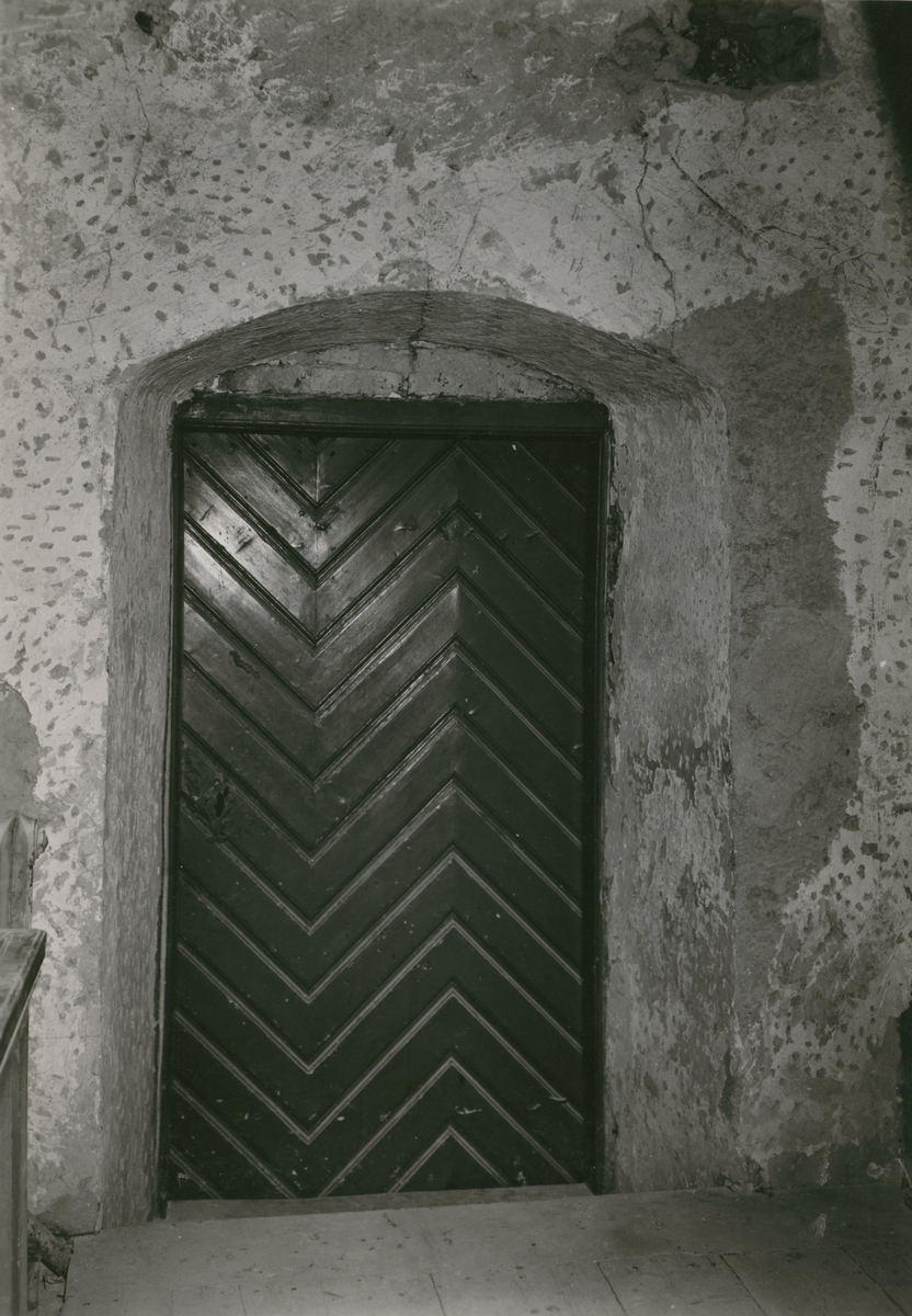 Skadad puts vid kyrkport vid restaureringen av Ryssby kyrka 1948.