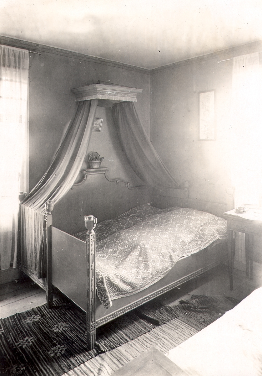 Gustaviansk säng av furu, nu målad i blått och guld har Har tillhört ägarens förfäder, boende på en gård i närheten.