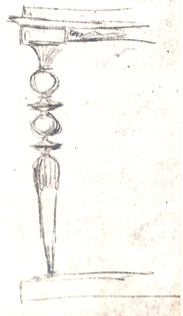Skiss av ett bord i empire med förgyllning och grön brons, och vit marmorskiva.
